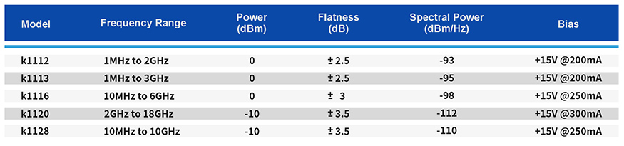 The k1000 series modules produce white Gaussian noise up to 0 dBm, covering frequencies up to 18GHz.